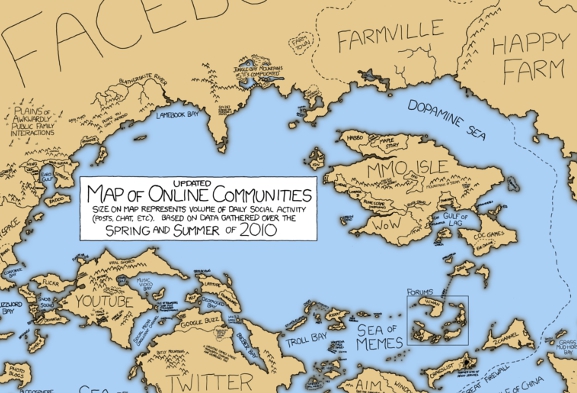 En el 2007, Randall Munroe, creador del sitio xkcd.com, un blog de caricaturas altamente seguido por los amantes de la tecnología, hizo muy popular en la red un mapa sobre las comunidades en Internet, donde los “países” eran proporcionales a la cantidad de usuarios que estaban en ella.