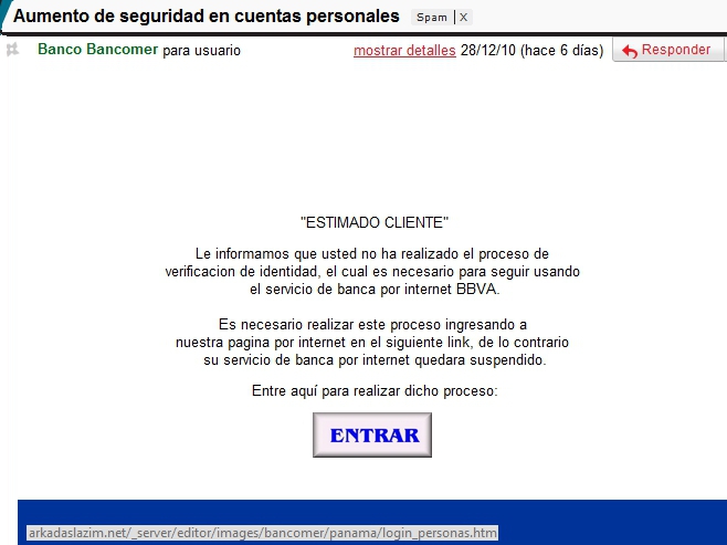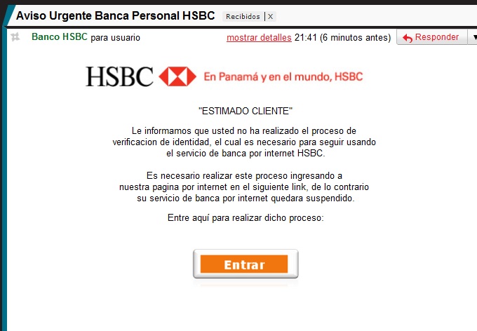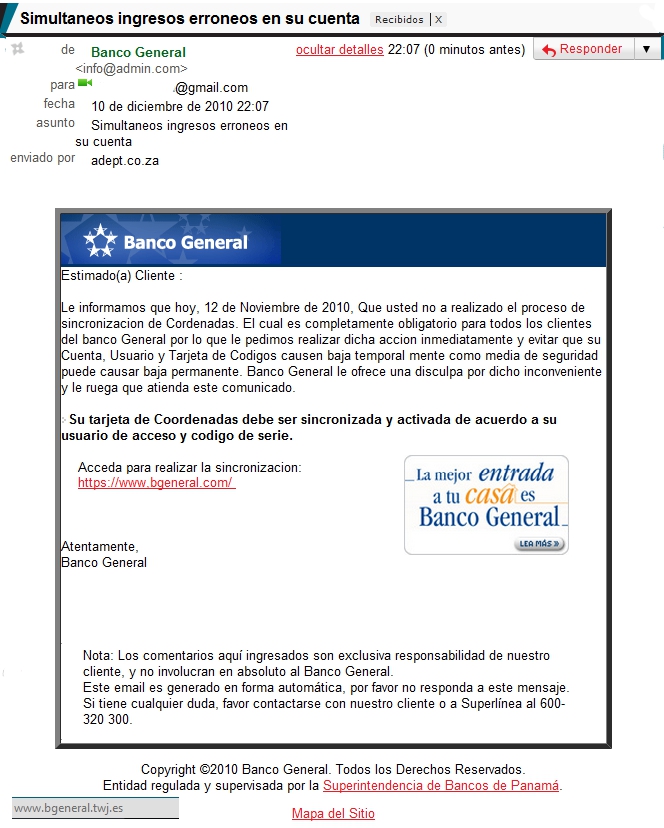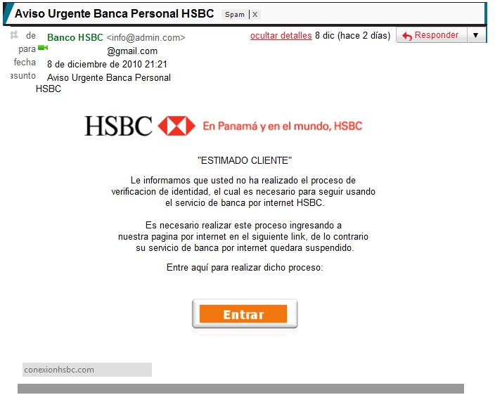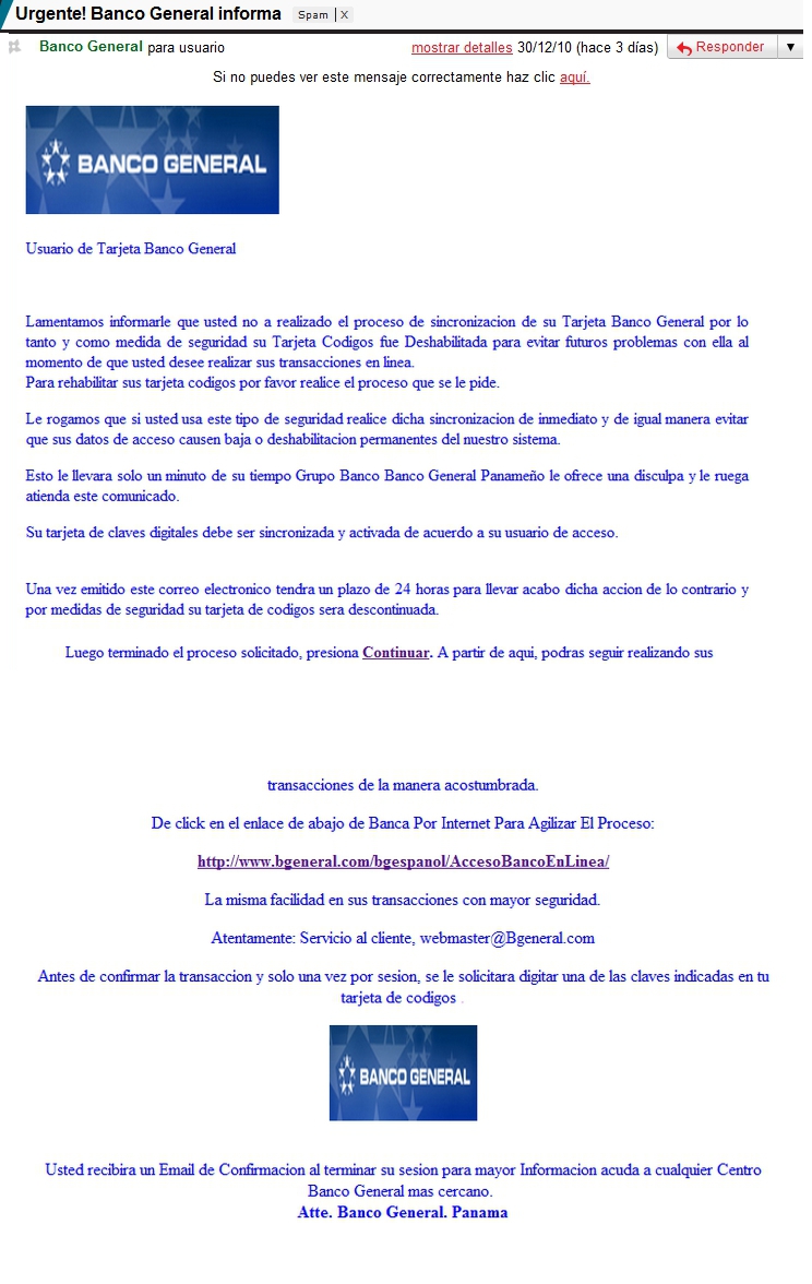 Revisando mi buzón de spam, me percaté que durante todo diciembre estos ataques estuvieron latentes con información falsa sobre bancos panameños, entre los que se incluyen Banco General, HSBC, y BBVA, aunque no dudo que estén rondando otros nombres.